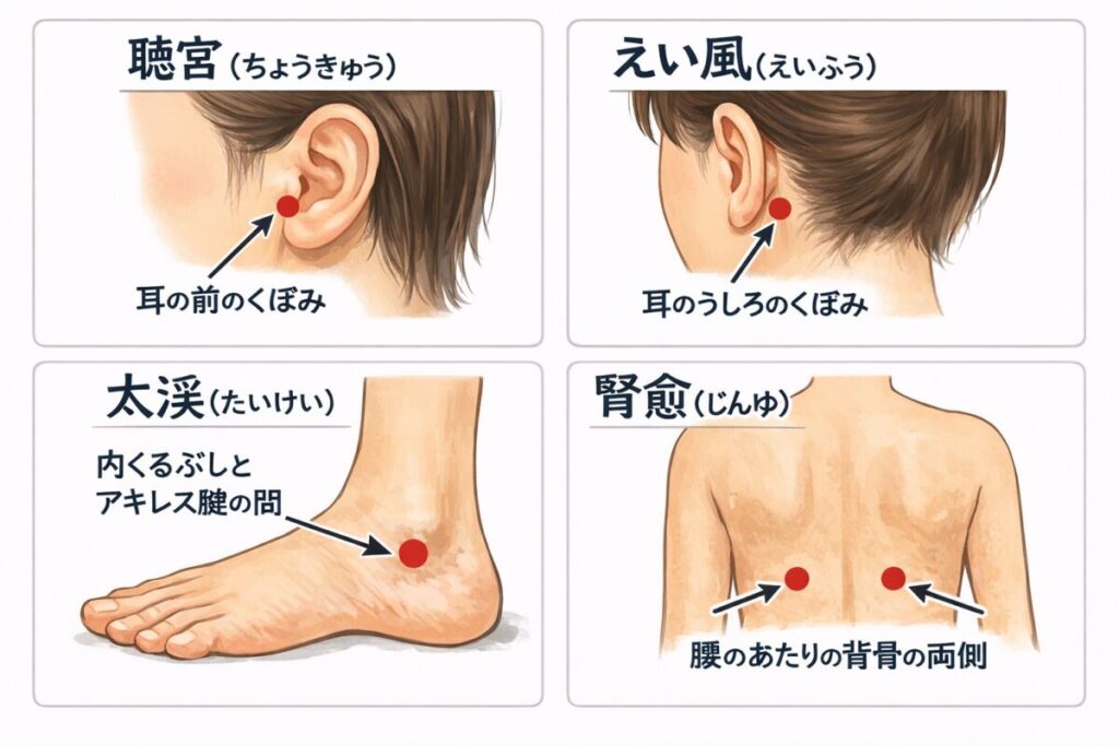 耳鳴りに有効な代表的なツボとしては、耳の周囲にある聴宮(ちょうきゅう)、翳風(えいふう)、そして腎の機能を高める太谿(たいけい)や腎兪(じんゆ)などがあります。これらのツボを適切に刺激することで、耳への血流改善と腎の働きを高める効果が期待できます。